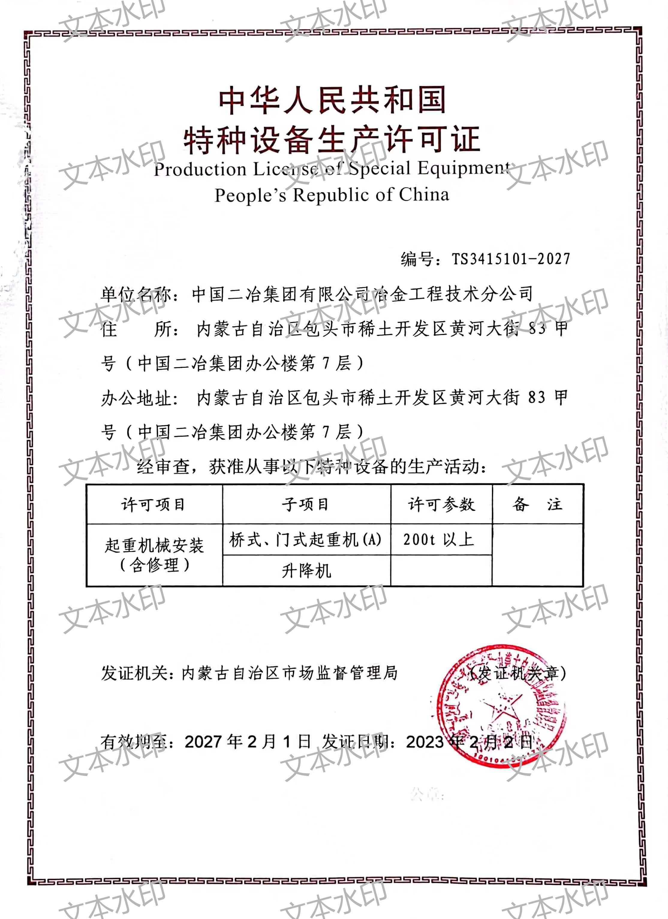 中华人民共和国特种设备安装改造维修许可证(起重机械)