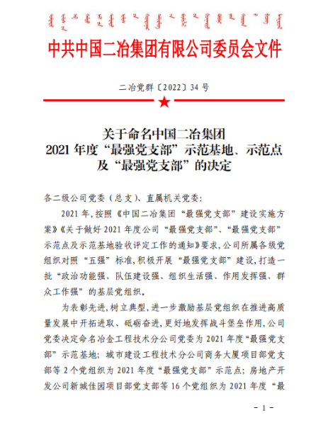 4月19日,城建分公司获中国二冶集团2021年度“最强党支部”示范点及“最强党支部”等二项殊荣,受到命名表彰。