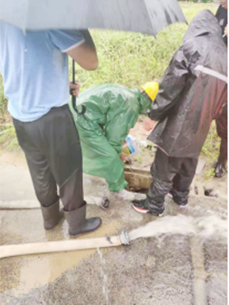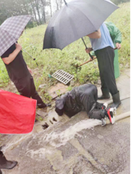 与“烟花”较量,攻坚克难保工期。7月28日,一阵阵急促的电话铃在项目部响起,项目部党员敖云袥立即接起电话,随后迅即冒着大雨在现场进行雨水管线排查,雨水浸湿了工鞋,裤管也被雨水打湿,大雨模糊了他的眼睛,但敖云袥毫不畏惧,只是用随身带的毛巾擦拭眼睛后继续检查,当走到施工现场一个污水管处,发现大量的雨水喷涌而出,涌入基坑,如果不及时抢修,基坑势必充满水被淹,影响基坑质量。具有34年党龄的敖云祜凭借多年丰富的工作经验,立即打电话报告项目部经理,项目部全体党员和管理人员准备好铁锹和抢修工具,迅速赶往污水管处,打响抢修战役,誓保基坑质量。时间紧迫,倾盆大雨还在持续上演,项目部班子成员率先垂范,身先士卒,在他们的带动下,全体管理人员心往一处想,劲往一处使,全力以赴投入到抢修中,在雨水中不怕脏不怕累排查管道爆裂源头。经过职工们不懈努力,当天晚上七点钟污水管抢修完成,及时从源头处对污水井进行封堵。有效防止雨水再次流入基坑,并立即组织现场排水。