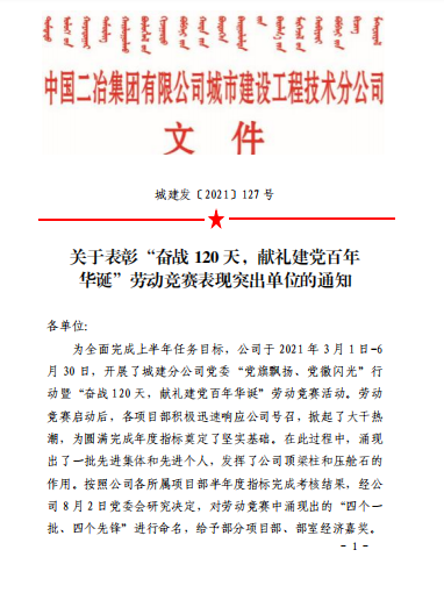 8月14日,城建分公司表彰了“奋战120天,献礼建党百年华诞”劳动竞赛表现突出的单位,分公司副总经理刘广文宣读了表彰决定。