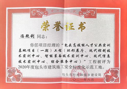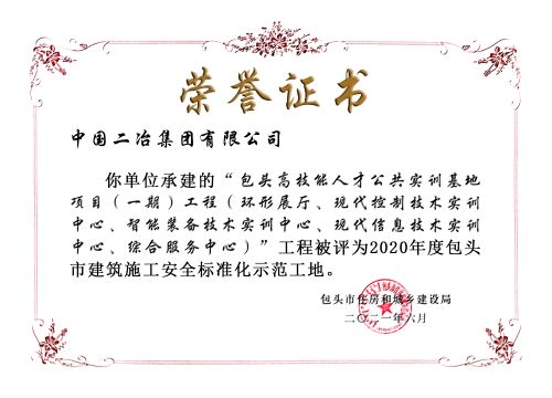 实训基地项目先后于2018年2月被评为中国中冶颁发的中冶安全文明标准化工地、2021年被内蒙古建筑业协会评为内蒙古绿色建筑工地、2020年10月初由中施企协会评审已通过的“中施企协绿色建造评价”为二星等多个安全文明类奖项,同时实训基地项目在2020年7月份组织的中国二冶集团内蒙古自治区片区“安全文明标准化”观摩活动中获得当地政府与集团公司的一致好评。