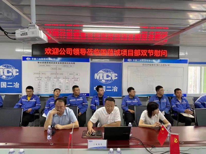 在霸州国蕴城项目慰问过程中。王蒙强、刘润明一行首先深入到项目施工现场,在查看项目节日期间的防盗防火、安全文明施工、环境保护、施工用电、工程施工进度等管理情况后,看望正在奋战的参战职工,紧握职工双手,亲切地问寒问暖,致以节日暖暖问候。王蒙强指出,本项目是集行政、金融、商务办公、文化教育、商业及居住为一体的综合服务中心,志在打造人居建设标杆项目。同时该项目对推动霸州市区域加速向新城蜕变,加快向京津冀中心城市群融合具有十分重要的带动作用。项目部要不负韶华,争分夺秒,抢抓工期,确保三季度亮出精彩成绩单。节日期间,项目部要绷紧安全弦,严格执行项目部班子带班制度。党员要发挥先锋模范作用,织密党员责任区安全网,保证职工安全度节日。党支部要开展“我们的节日-礼赞新中国奋进新时代”主题活动,通过两地视频分享亲情故事,共叙在党的关怀下,过上幸福美好生活的故事。最后,王蒙强、刘润明一行祝福项目部全体职工身体康健,生活甜甜蜜蜜、团团圆圆的同时,向项目部送上了慰问金。