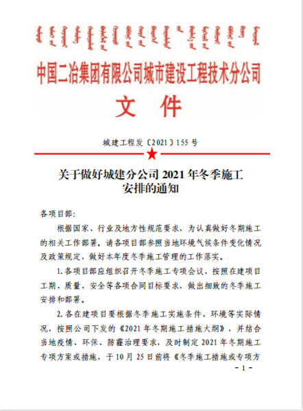 进入10月份,北方地区气温逐步降低,早晚温差大,最低气温已突破零下3摄氏度,气温走低对施工生产带来来极大影响。城建分公司针对在包地区项目居多的实际,迅速安排,深入到一线检查,并及时安排冬季施工,要求在建项目参照当地环境气候条件变化情况、政策规定,结合当地疫情、环保、防霾治理要求,认真制定 2021 年冬期施工专项方案或措施,编制施工材料进场、劳动力、施工人员培训计划等技术准备工作,加强秋冬季施工安全管理,确保全年安全生产目标实现。要严把现场管理“安全关”,认真做好土方工程、砌筑工程、混凝土工程、钢筋工程冬期施工技术和质量控制,确保冬期施工做到材料、人员、措施、责任“四到位”。项目部要再紧紧手、加把劲,以天保月,以月保季,奋力推进,确保在建项目务必按照时间节点高质量完成年度节点工期。