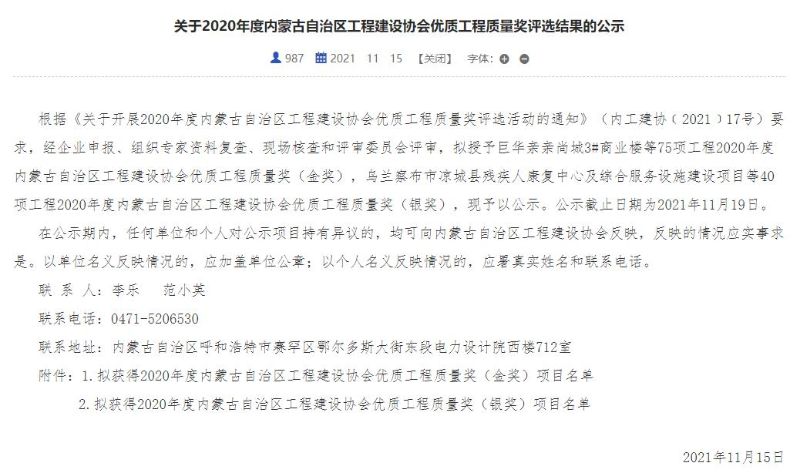 “内蒙古自治区工程建设协会优质工程质量奖” 评选活动是内蒙古首次设立的重要奖项,旨在进一步落实自治区“以质取胜,建设质量强区”发展战略,促进工程建设质量和技术创新水平稳步提升,打造北疆亮丽风景线。中国二冶通过参加优质工程质量奖评选活动,有效的发挥了公司精品工程示范引领作用,使公司不断总结先进工艺做法和工程管理经验,并且积极的推动了公司各项工程质量安全管理水平的整体提高,为公司高质量发展起到了积极的促进作用。