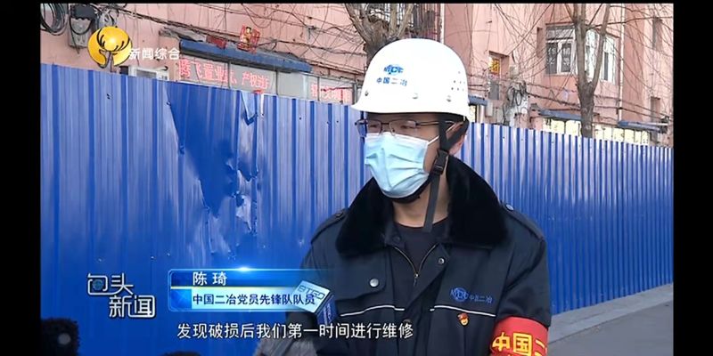 早上8点,记者听到一阵阵敲打声、看到一抹抹抗疫红,打破了街道的宁静,中国二冶党员先锋队成员有的手拿手枪钻,有的手拿钳子,仔细巡查着封控小区的每一处围挡。包头电视台记者深入中国二冶城建分公司所负责的少先路街道管辖的社区围挡施工建设点进行跟踪报道,采访了项目部经理陈陭。