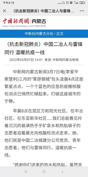 3月7日,中国新闻网报道了题为《(抗击新冠肺炎)中国二冶人与雷锋同行 温暖抗疫一线》宣传报道,