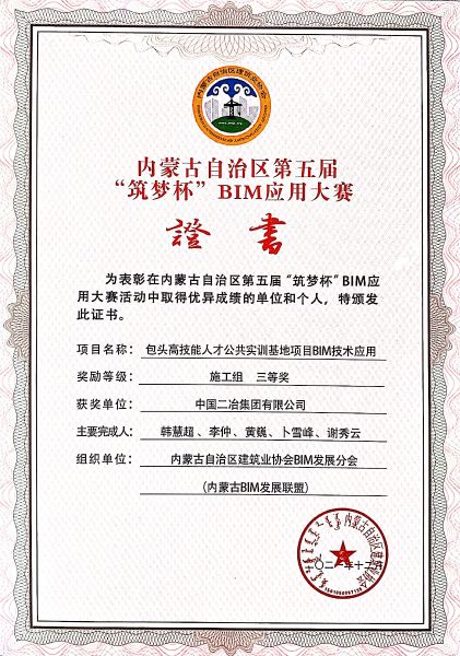3月28日,经过专家组层层评审,中国二冶实训基地项目荣获内蒙古自治区第五届“筑梦杯”BIM技术应用大赛三等奖。