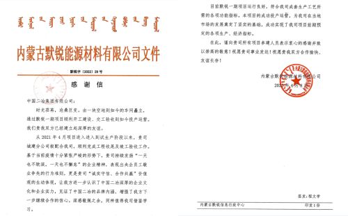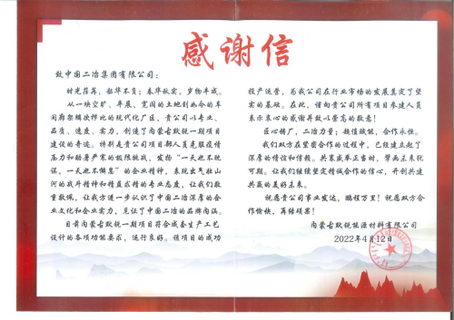 4月8日和12日,中国二冶连续收到内蒙古默锐能源材料有限公司的两封感谢信,盛赞中国二冶在默锐一期项目建设中,突破工期紧任务重等不利因素,高标准严要求,精益求精匠心智造,披荆斩棘打造样板工程,优质快速完成工程建设任务,充分彰显冶金建设国家队的央企责任和担当。