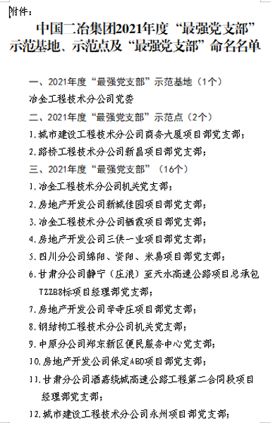 4月19日,城建分公司获中国二冶集团2021年度“最强党支部”示范点及“最强党支部”等二项殊荣,受到命名表彰。