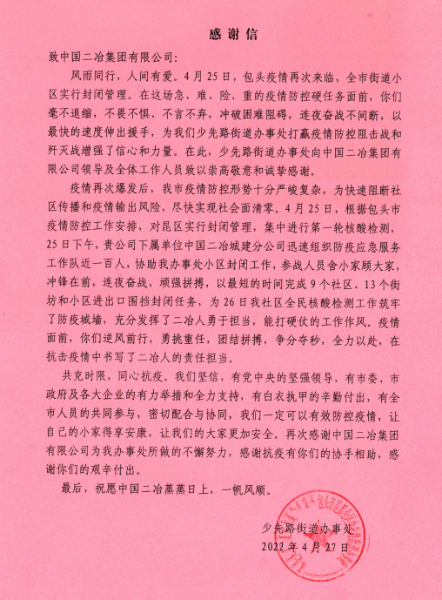 4月27日,包头市昆区少先路街道办事处致中国二冶感谢信,表扬中国二冶在这场急、难、险、重的疫情防控硬任务面前,毫不退缩,不畏不惧、不言不弃,冲破困难阻碍,连夜奋战不间断,以最快的速度伸出援手,近一百名职工冲锋到社区疫情封控一线,全力配合昆区政府顺利完成任务。特向中国二冶干部职工致以崇高敬意和衷心感谢!