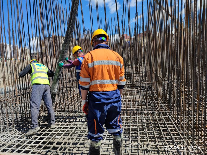 本工程于6月26日开工后,中国二冶城建分公司提高政治站位,锚定必须打造援外项目示范工程奋斗目标,突破蒙古三轮疫情来袭的严峻形势,未雨绸缪,提前策划,编制项目创优创奖方案、劳动纠纷应急预案、安全生产应急预案、舆情防控应急预案、疫情防控措施,保证工程高起点、高标准推进。在此基础上,项目部针对工程水文条件复杂、大型筏板基础施工难度大、人员紧缺等重重困难,制定赶工计划,倒排工期,倒逼进度,把疫情防控耽误的工期抢回来。与此同时,项目部增加现场作业人数,合理优化人力资源,满足施工高峰期需要。连日来,项目部管理人员克服蒙古地区水土不服、高温干热等恶劣环境,采取分区分块、平行施工与流水作业等灵活多样的施工方法,加快推进工程施工进度,8月7日,1#楼558立方米混凝土经过参战职工连续14小时持续奋战,全部浇筑完成,就此宣告中华人民共和国援建中国二冶承建的蒙古国棚户区改造项目首栋楼筏板基础浇筑完成。