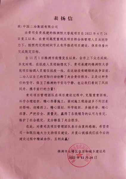 11月24日,中国二冶收到株洲市石峰区住房和城乡建设局发来的表扬信,对中国二冶承建的株洲恒大誉苑项目自4月26日复工以来的项目管理举措及突发疫情情况下的央企担当表示肯定,对项目管理团队表示赞扬。