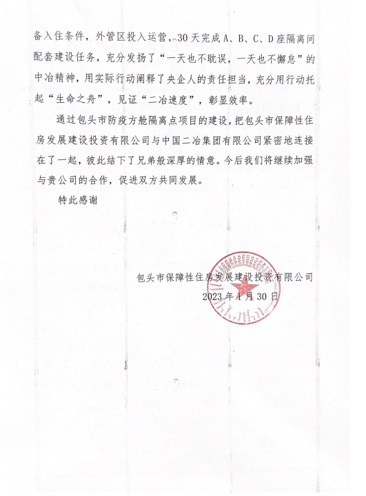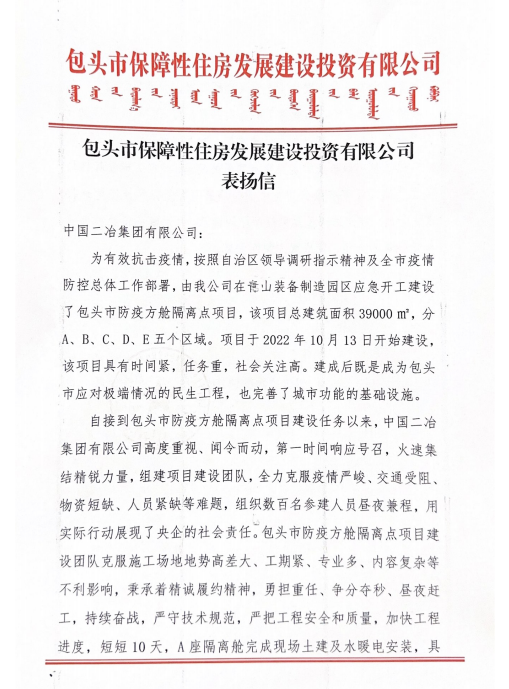 表扬信中写道,为有效抗击疫情,中国二冶高度重视,闻令而动,第一时间响应号召,火速集结精锐力量,组建项目建设团队,全力克服疫情严峻、交通受阻、物资短缺、人员紧缺等难题,组织数百名参建人员昼夜兼程,用实际行动展现了央企的社会责任和担当。在项目建设中,中国二冶包头市防疫方舱隔离点项目建设者克服施工场地地势高差大、工期紧、专业多、内容复杂等不利影响,秉承着精诚履约精神,发扬雷厉风行,使命必达的作风,勇担重任、争分夺秒、昼夜赶工,持续奋战,严守技术规范,严把工程安全和质量,加快工程进度,艰苦拼搏47天,快速完成项目A、B、C、D四座隔离点建设任务,确保1067套隔离用房正式投入使用,为鹿城疫情防控奉献二冶强大力量,彰显央企硬核实力和担当。