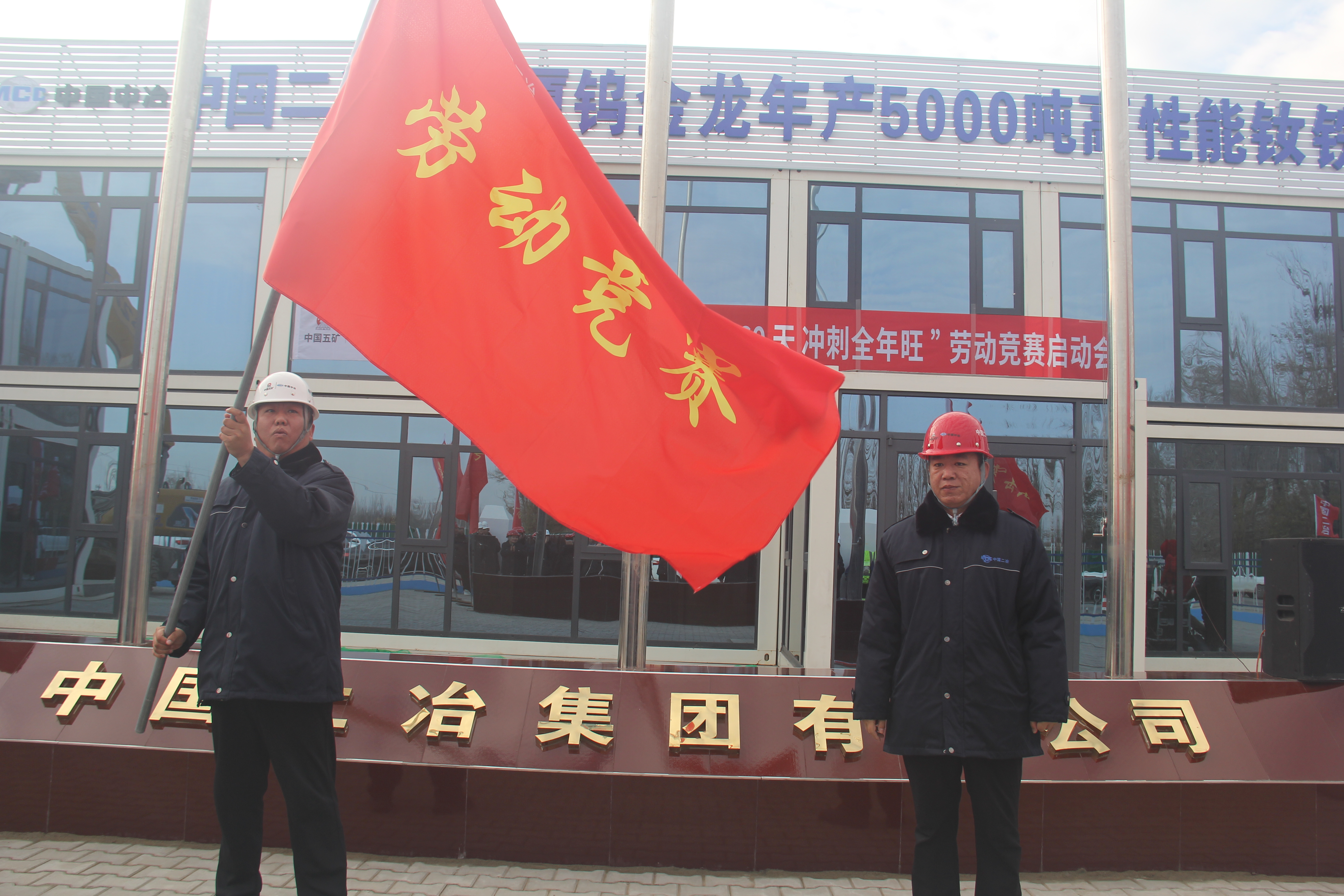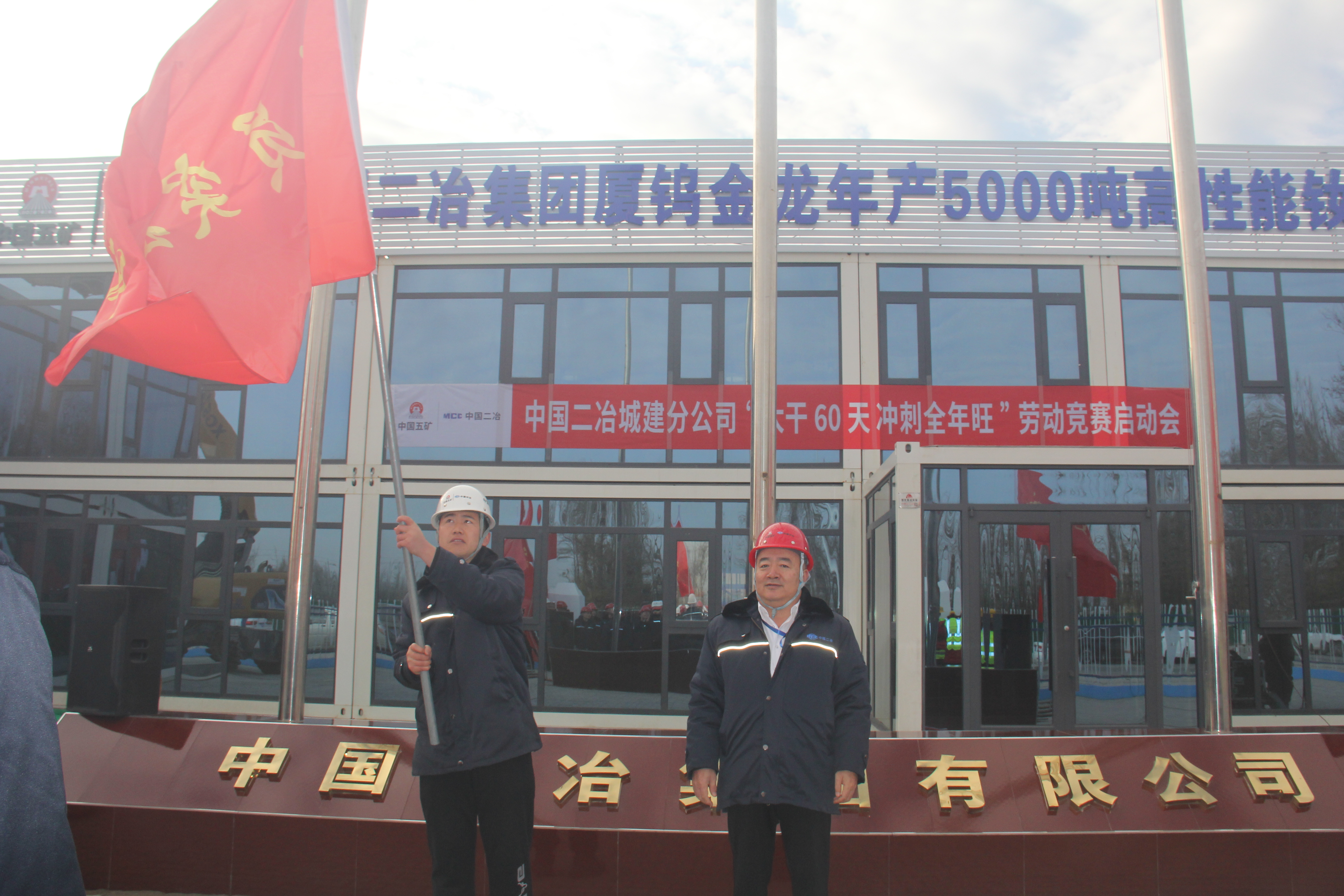 分公司纪委书记尚书一宣读《中国二冶城建分公司“大干60天 冲刺全年旺”劳动竞赛实施方案》,总会计师高清宣读中国五矿“大干60天 冲刺全年旺”倡议书,总工程师刘润明部署安全质量工作,项目部负责人、党员突击队、青年突击队代表进行表态发言,与会领导为参战各方授竞赛“战旗”。