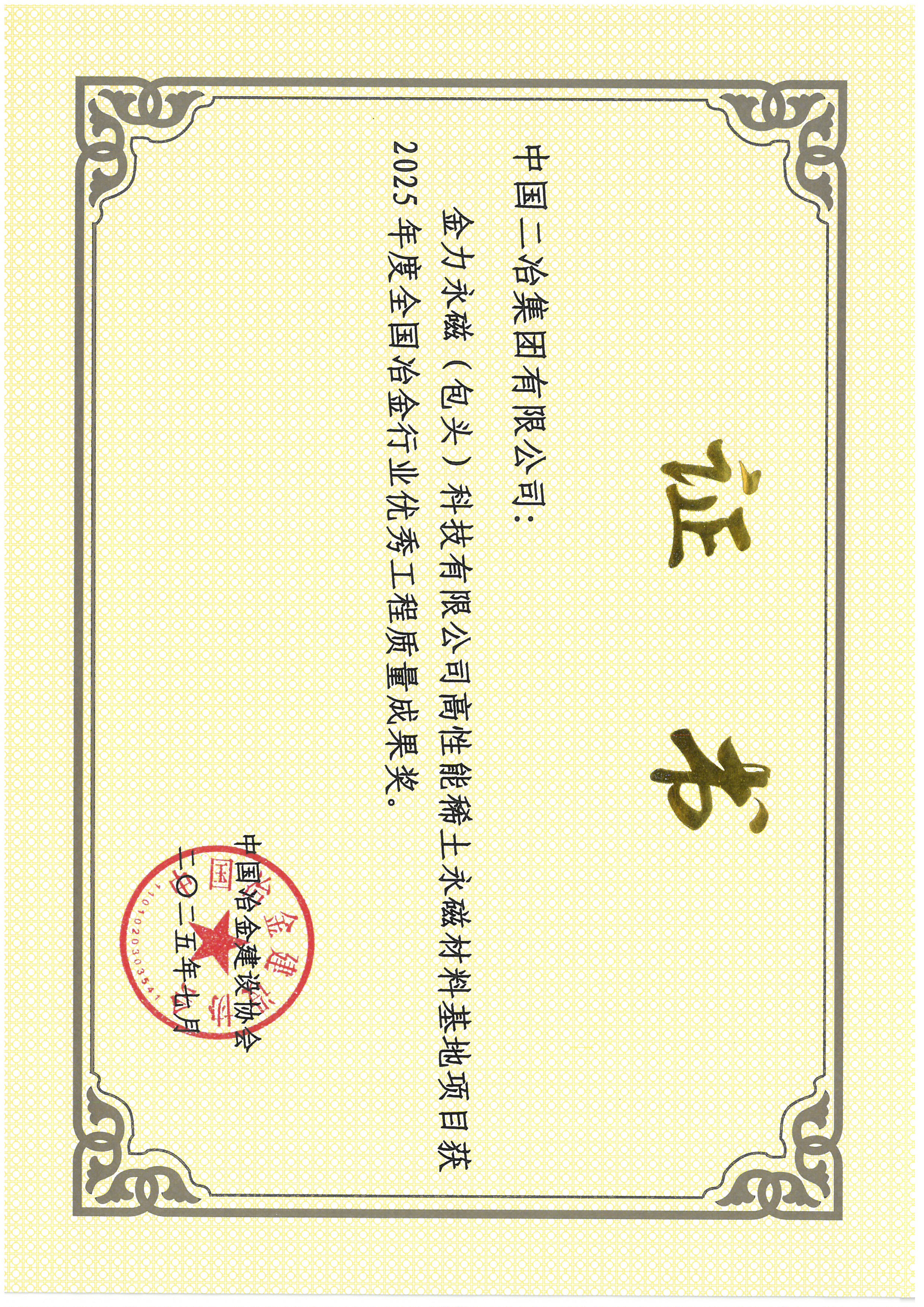 近日,中国冶金建设协会发布2025年度全国冶金行业优秀工程质量成果奖评奖结果,城建分公司金力永磁(包头)科技有限公司高性能稀土永磁材料基地项目荣获2025 年度全国冶金行业优秀工程质量成果奖,再一次有力彰显了品牌二冶的技术实力和创新精神。