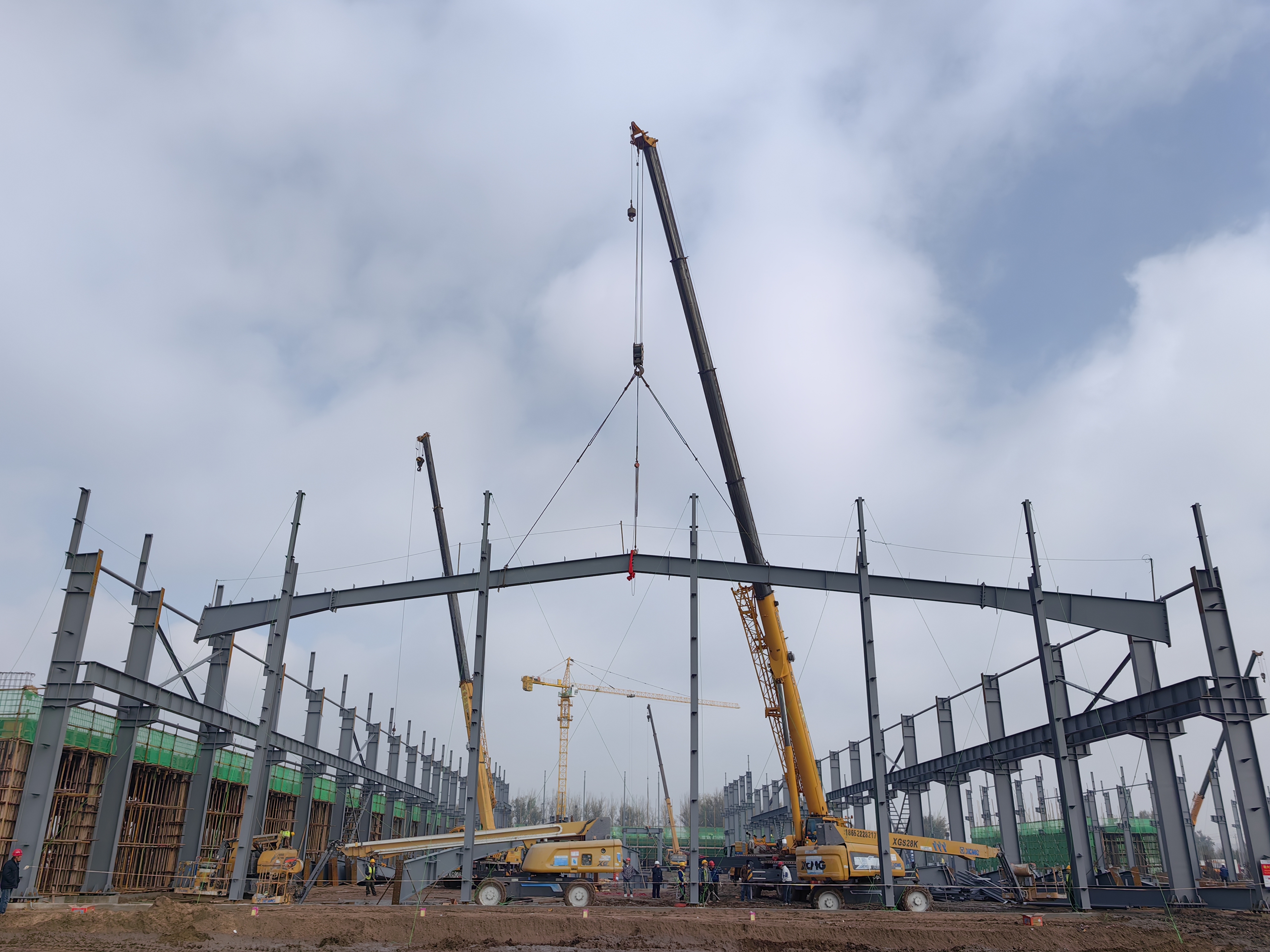 本项目坐落于包头稀土高新区朝阳路以东,腾飞大街以南,凌云路以北,星辉路以西。其中,由城建分公司施工的2#生产车间建筑面积2455.6平方米,单层门式钢结构,高度15.73米,最大单跨跨度34.6米;3#生产车间建筑面积20167.86平方米,主体为单层门式钢结构,附属局部一层、三层混凝土框架结构,高度16.1米,最大单跨跨度43.1米;连廊建筑面积82.35平方米,混凝土框架结构,高度10.8米,最大单跨跨度13.5米。工程内容包括建筑、结构、给排水、电气、暖通等。工程开工建设后,项目部针对钢梁长达41.3米,重8吨,吊装体量大,难度高,属于危大工程的实际,提前制定危大工程施工专项方案进行专家论证,合格后方可吊装。吊装中,项目采用可用拉钢丝法和仪器放线法进行校正,保证钢梁垂直度允许偏差控制在5mm之内。10月22日当天,现场吊车林立,机械轰鸣,礼炮齐鸣,一台75吨吊车将3#车间第一榀钢梁缓缓起升到位顺利安装成功。