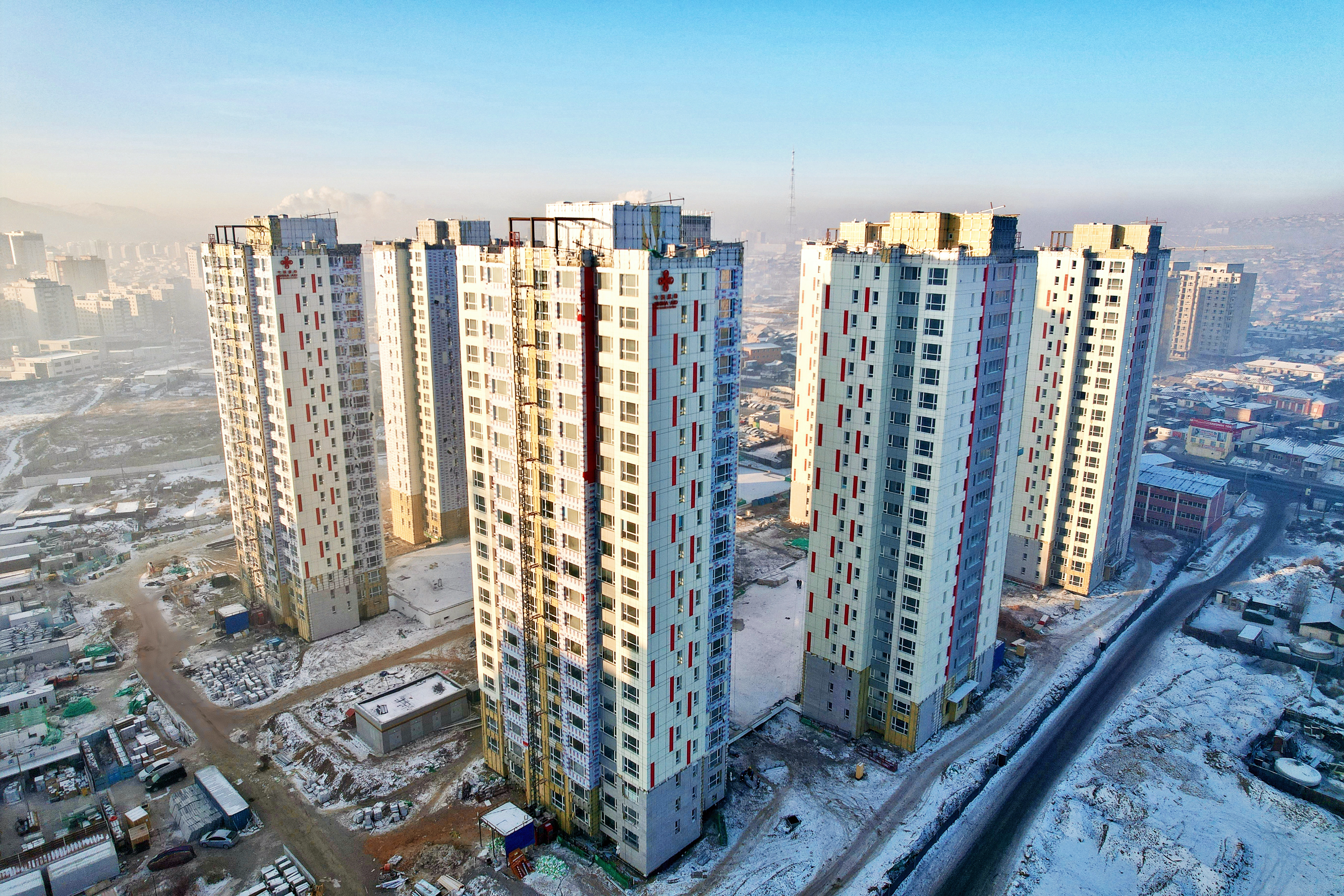 本项目是中蒙两国政府和人民共同关注的重要民生工程,是睦邻两国高质量共建“一带一路”,携手实现共同发展繁荣的友好见证。工程位于蒙古国首都乌兰巴托市,总建筑面积9.3954万平方米,主要包括8栋住宅楼、地下车库、配套设备用房、室外活动场地、小区道路、绿化硬化、外网等施工内容。工程开工建设后,项目部克服当地气候条件恶劣、两国施工技术差异大、材料供应短缺、有效工期短促等不利因素,战低温、顶强风,冒雨雪,掀起大干热潮,接连不断完成主体结构、二次结构、外墙装饰等施工节点任务,受到蒙古国建设部表彰,收到蒙古国项目办和中国驻蒙古国大使馆表扬信和感谢信。