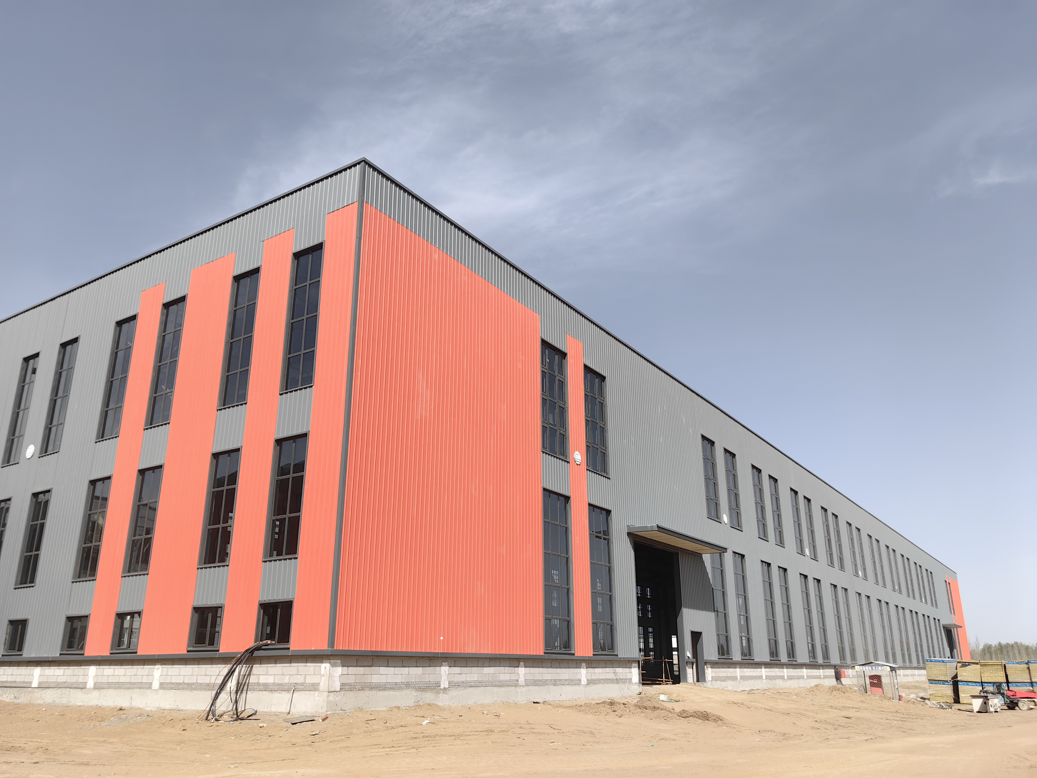 本项目共包括四栋车间。其中,D1、D2车间为二层钢筋混凝土框架结构厂房,建筑面积均为 8321.26平方米,E1、E2车间为钢结构厂房,建筑面积均为 5992平方米,主要包括建筑、结构、给排水、电气等,消防、空调系统等施工内容。工程开工建设后,面对包头地区极低的气温,项目管理团队创新构建“三位一体”冬季施工体系,通过建立全封闭材料仓储系统,搭建温控监测平台,实施分时段轮岗作业机制,在确保施工质量安全的前提下,全体建设者顶强风,战严寒,提前高效优质完成四栋车间施工任务,经过验收小组综合检查,认为工程建设规范合法,工程实体质量、观感质量符合设计及规范要求,各类检测资料齐全,一致认为工程符合规定,一次顺利通过验收。