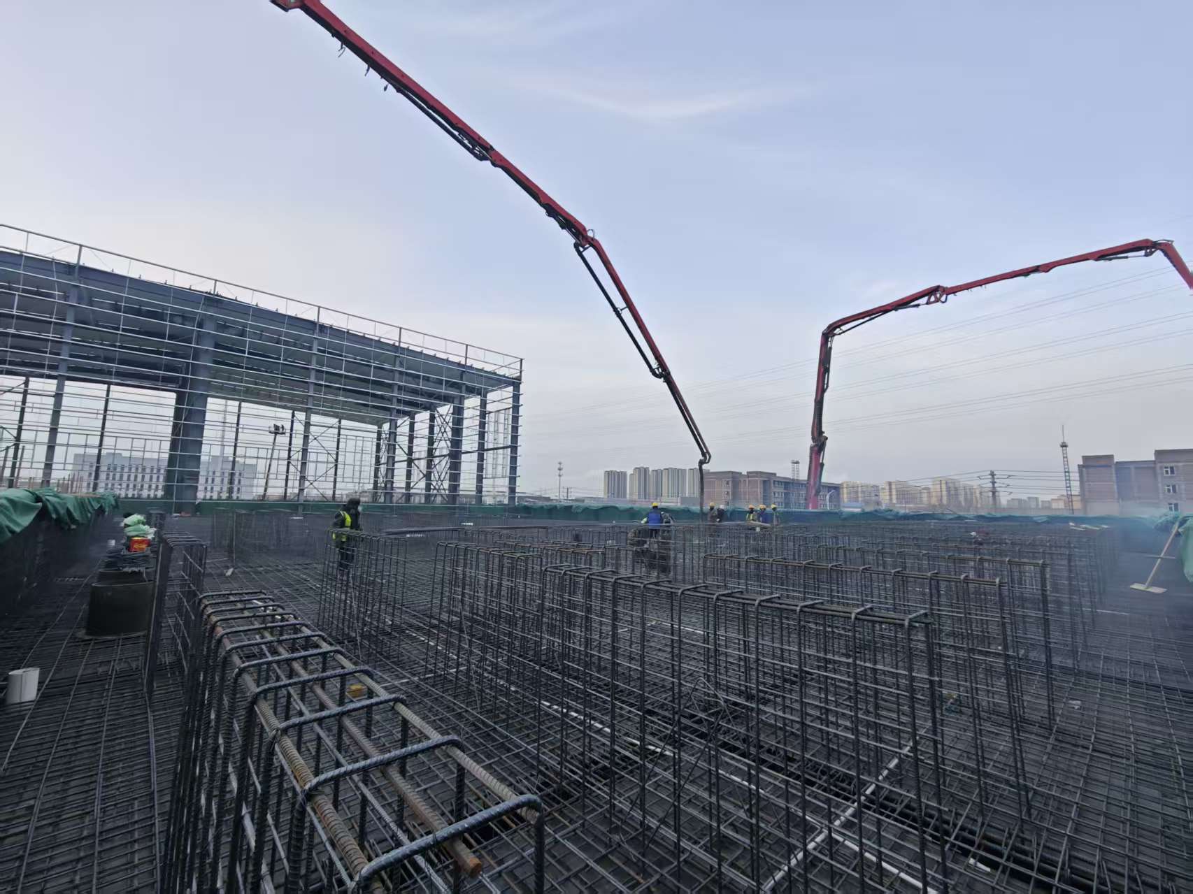 工程于9月17日开工后,面对项目场地受限、大体积筏板基础混凝土浇筑任务繁重、车间钢结构跨度大、有效工期短促等重重挑战,项目团队精心组织施工,合理配置资源,推行策划先行理念,深化BIM技术应用,实现全专业建模、图纸审查与施工指导并联协同。在确保施工安全和质量的前提下,项目采取“分区域施工+动态调整+24小时轮班作业”等施工方法,制定施工路线图,组织百余名建设者,突破包头地区多雨强风与冬季严寒的双重考验,仅仅用105天高效优质完成全部单体工程主体结构施工任务,实现全线封顶目标。累计开挖土方171407立方米,回填土方8700立方米,绑扎钢筋2039吨,浇筑混凝土20700立方米,钢结构安装3917吨,工程建设跑出“二冶速度”,彰显了驻地央企的责任担当和实力。