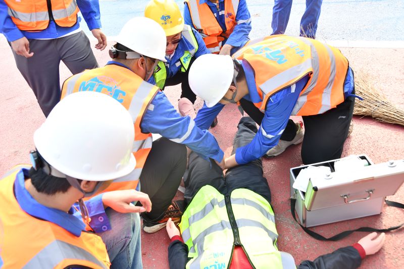 上午午8时30分,随着本次演练总指挥的一声令下,演练正式拉开帷幕。施工现场某工人在扫地时突然遭受机械伤害,项目经理接到情况汇报后,立即启动应急救援预案,现场副总指挥随即发出通知,给小组迅速赶往事故现场,后勤保障组保障所需物资充分供应,安全疏导组有序的进行人员疏散,医疗救护组立即对伤员伤势进行判定现场进行简单止血绑扎,现场警戒组组织保护事故现场。各小组分工明确、相互配合,每个环节衔接有序,“伤者”受到快速救治并及时送医,实战效果得到充分检验。