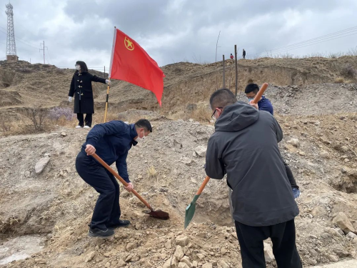 植树现场,大家三五成组,一同扶苗、培土、围堰、浇水、合力种下山桃、丁香等5100珠树苗,新栽的树苗迎风而立,为这个春天增添了勃勃生机。