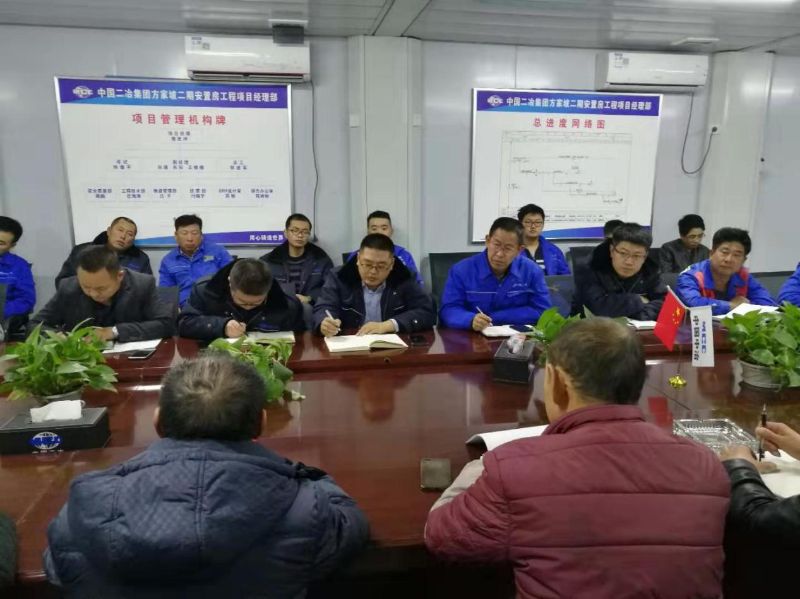 11月12日,兰州新区方家坡二期安置房项目经理部组织召开工程例会,参加本次会议的有项目经理樊思坤、项目副经理孙瑾、总工郭建军、工程技术部任海涛、项目部全体管理人员和安徽朗行、上海方桓、甘肃佳成三家劳务公司主要负责人。
