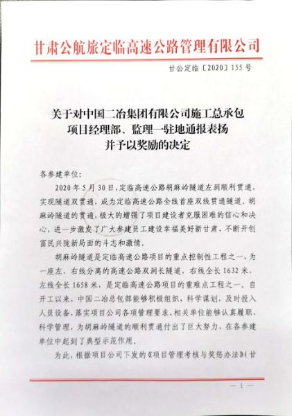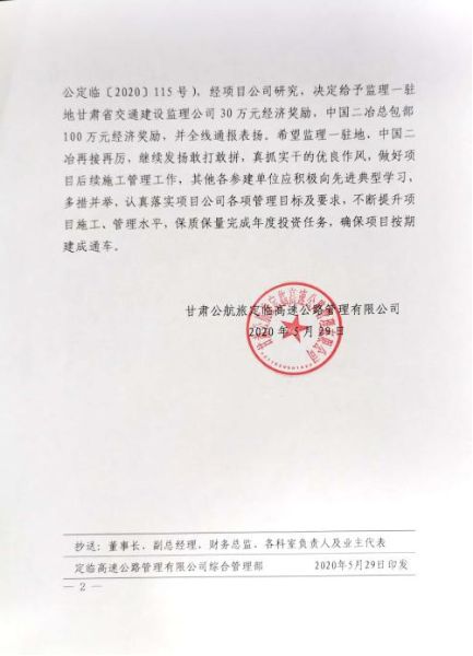 5月30日,定西至临洮高速公路工程项目公司下发甘公定临【2020】155号《关于对中国二冶集团有限公司施工总承包项目经理部、监理一驻地通报表扬并予以奖励的决定》,对甘肃分公司定临高速项目部提出全线通报表扬并奖励100万元整。