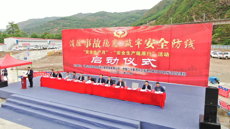 启动会上,天庄项目公司副总经理张华宣读天庄高速公路建设项目2020年“安全生产月、安全生产陇原行”活动实施方案、天庄项目公司监事会主席马钧剑做动员讲话、中国二冶集团天庄高速总包8标项目经理耿东红代表总包单位做表态发言、陕西高速公路工程咨询有限公司天庄监理4标驻地监理工程师杨俊杰代表监理单位做表态发言、天水市交通运输局副局长王平子讲话、天水市应急管理局副局长孟福荣宣布“安全生产月”暨“安全生产陇原行”活动启动等7项议程。旨在通过开展以“消除事故隐患,筑牢安全防线”为主题的“安全生产月”活动,着眼加强疫情防控常态化条件下安全生产和扎实开展安全生产专项整治三年行动,以树牢项目全体参建人员安全发展思想、传播安全生产知识、增强安全意识、提升安全素质、压紧压实安全生产责任、深入排查安全风险隐患和问题整改、坚决遏制重特大事故发生、杜绝一般安全事故为目标,以强化安全红线意识、推进标准化管理、深化专项整治、深化改革创新等为重点内容,来促进天庄高速公路项目安全生产形势持续稳定向好,努力实现零事故、零伤亡的安全管理目标。