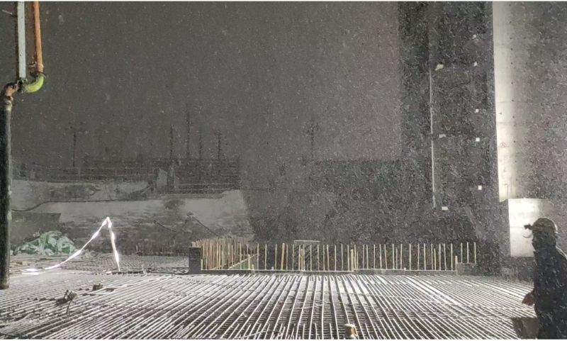 浇筑过程中,天气骤变,突降暴雪,道路被冰雪封堵,为了保证浇筑顺利进行,项目部管理人员以不惧风雪,不畏严寒的精神,顶风冒雪,与附近各个商混站第一时间取得联系,并最终在全体工作人员的共同努力下按计划完成了施工生产任务。