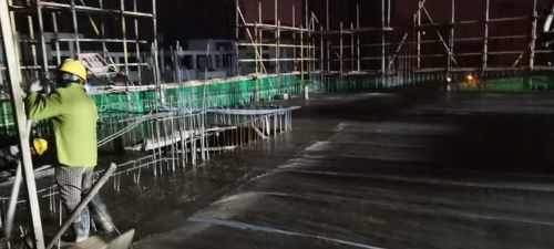 该工程为房屋建筑工程,位于濉溪县老城区,为了尽快满足住户入住条件,故本次7#楼主体结构封顶工作自开始施工以来,就广受业主方关注。项目部在保证安全生产和工程质量的前提下,各部门人员在项目部领导班子的带领下,紧密协作配合,坚持跟班作业,协调现场,形成安全质量巡检常态化,严格控制加强筋等钢筋绑扎以及水电预埋、防雷接地施工质量,并在混凝土浇筑前,提前与商砼站沟通联系,避免浇筑混凝土时出现供料不足现象,影响浇筑质量。终于,项目部在连续作业5小时,浇筑混凝土120m³,绑扎钢筋57t的前提下,圆满完成了此次第二标段最后一栋主楼主体封顶的既定目标,取得了阶段性的胜利。