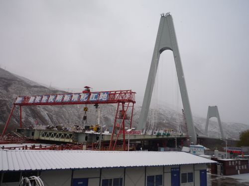 截止目前,该项目南北两岸112根主桥斜拉索已全部架设完成;钢箱梁锚拉板已安装定位84个,完成斜拉索张拉24根;G109国道位于柴家峡水电站内的引桥桩基开始混凝土浇筑;南岸钢柱套已完成混凝土浇筑9个;北岸22#-24#盖梁已完成混凝土浇筑,其他盖梁正在加紧进行钢筋和模板安装;钢箱梁内配重混凝土每天完成浇筑量120立方米;南北两岸钢箱梁节段已全部进场,正在加紧安装;高阻尼支座已进场,预制混凝土箱梁架梁施工正在加紧筹备。