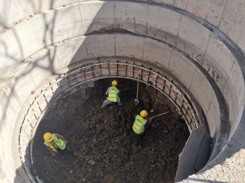 11月26日,进场以来施工人员在施工现场条件苛刻的情况下日夜不停的赶进度。顶管井采用“逆作法”进行施工,一天开挖一节、支护一节,相比较沉井施工大大减少了施工工期。井壁主体做完之后再进行封底预埋顶管设备,顶管管径1.2米,开挖采用最原始的人工挖土方式,由于管道中照明不足、空气质量差、管道直径较小且当地土质较差,每次只能同时进去一名作业人员且开挖长度及时间不能过长,每隔半小时就要替换另外一名作业人员继续施工。施工进度极其缓慢每昼夜顶进8米,为了不影响工期作业人员实行两班倒制24小时连续作业。