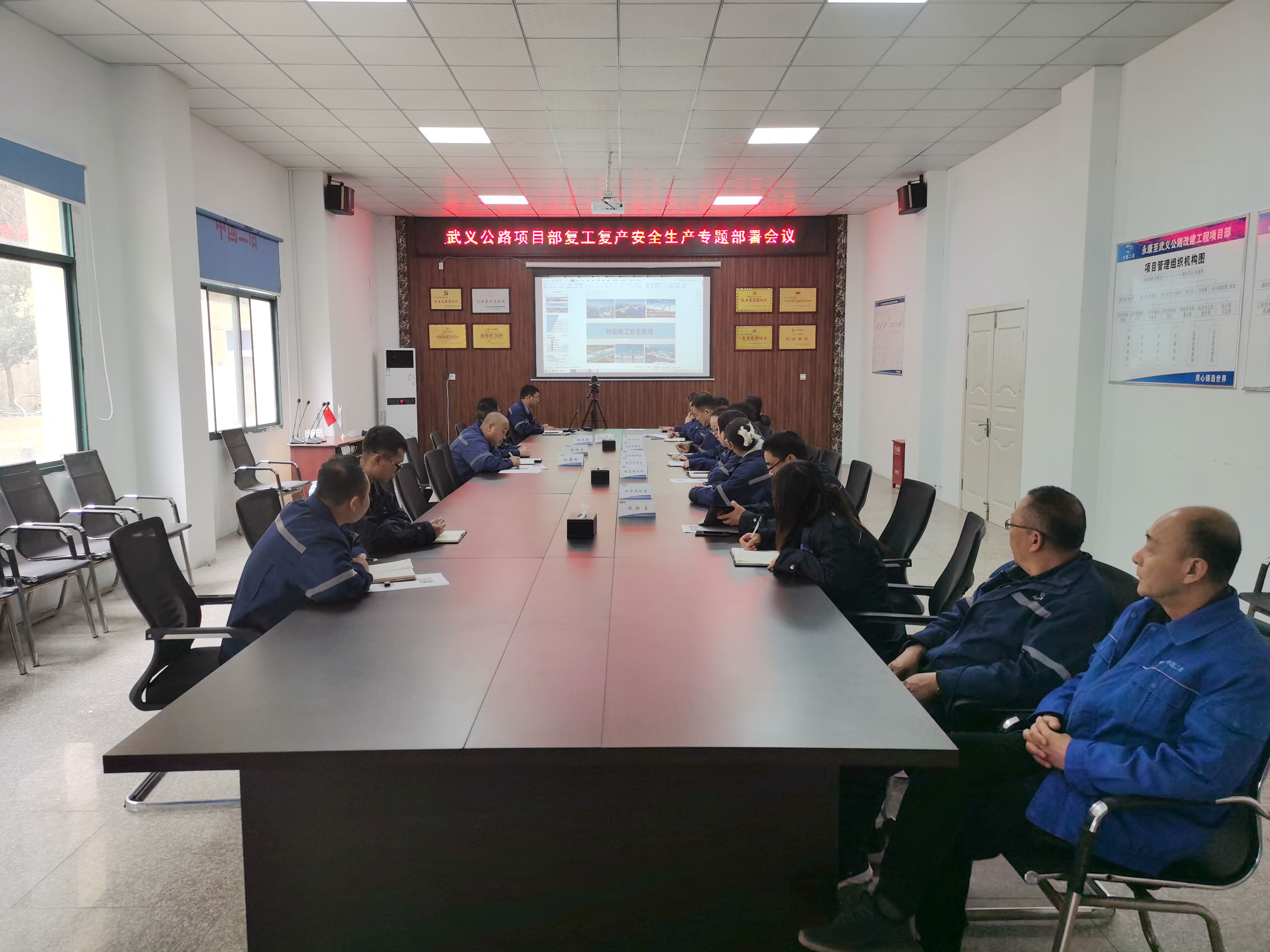 为贯彻落实两级公司安全警示教育暨复工复产安全生产工作再部署再落实会议精神,切实做好施工现场安全生产各项工作,全面落实安全生产责任,进一步提升安全生产监管水平,保障施工生产平稳运行。2月23日,路桥分公司武义项目部组织召开复工复产安全生产专题部署会,项目部全体人员参加。