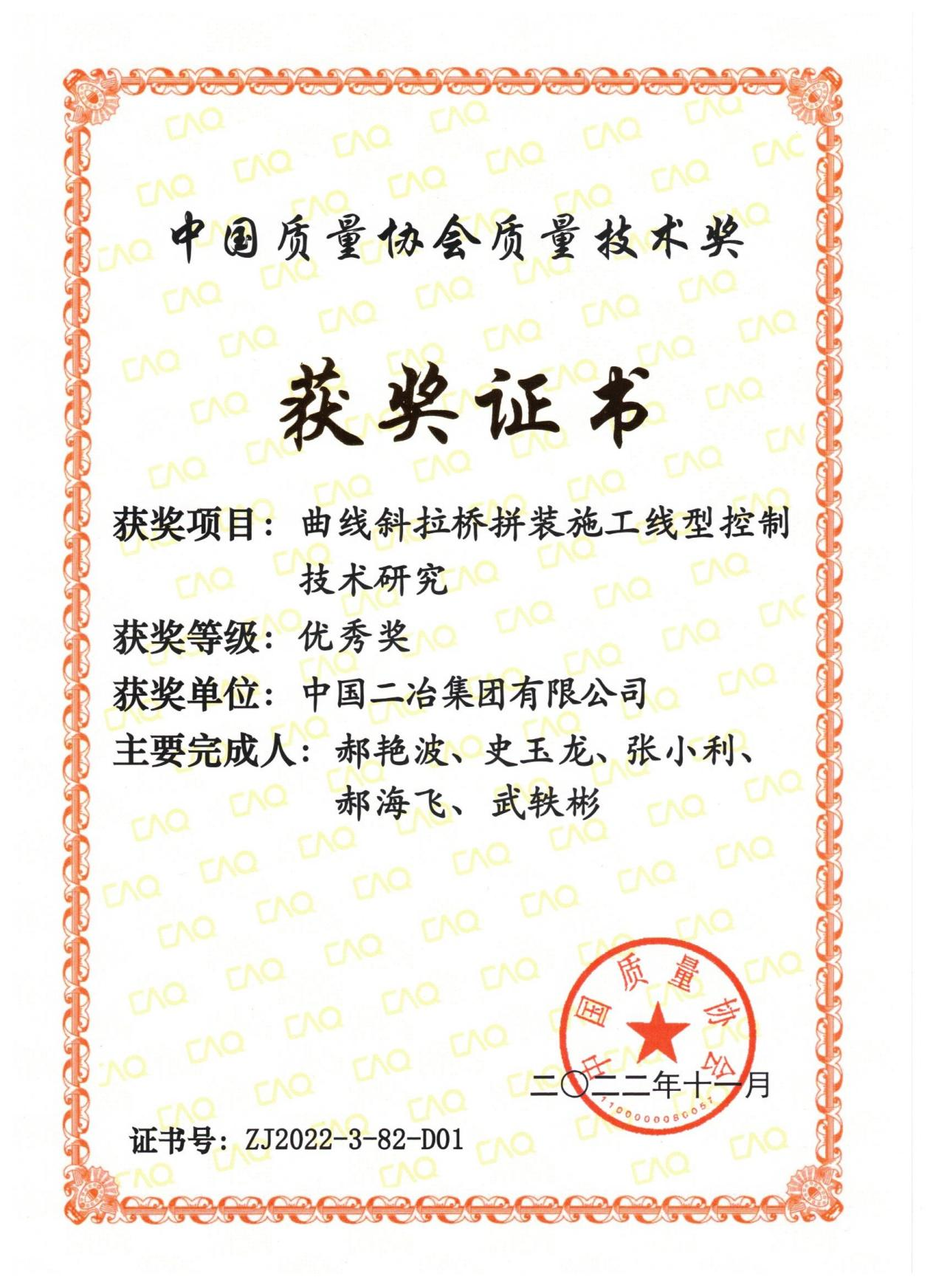 精益求精,铸就品质典范。2月9日,中国二冶收到中国质量协会颁发的证书,由路桥分公司申报的“曲线斜拉桥拼装施工线型控制技术研究”荣获2022年度中国质量协会质量技术优秀奖。此殊荣也是我国质量技术领域的最高奖。