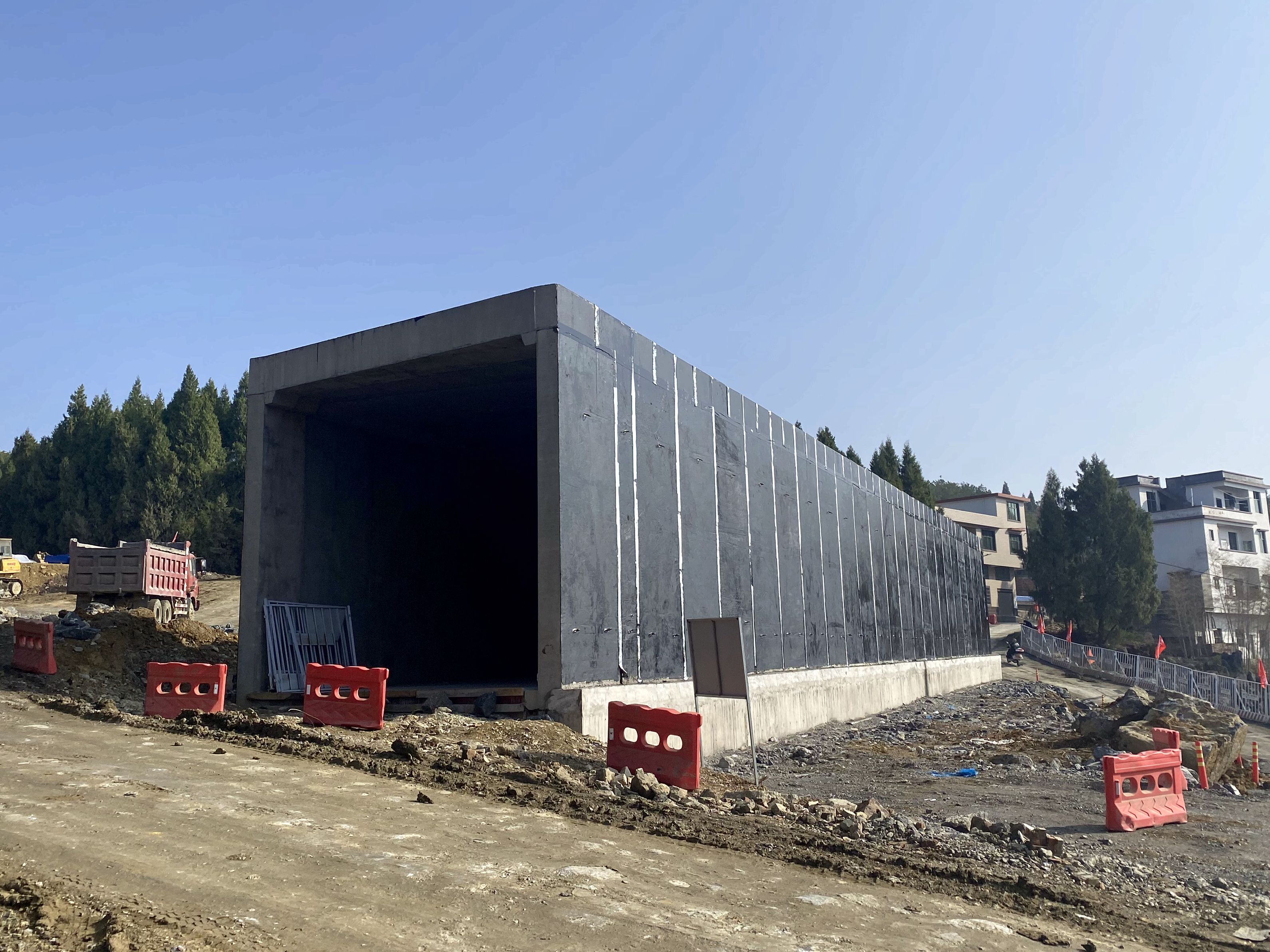 该项目主线计划设置装配式涵洞通道12道。施工前,项目部根据涵洞所处的地理位置及施工要点等,提前制定施工计划及技术措施。传统现浇模式涵洞施工会给附近百姓出行带来不便,同时也存在较大的安全隐患。为最大限度减少对当地百姓出行造成影响,项目部最终采用预制装配式涵洞施工,在质量、进度、安全、环保等方面均有着突出优势。通过工厂化生产、装配化施工,避免了过去涵洞施工点多分散、队伍杂、施工水平参差不齐、混凝土品质难以控制等隐患,提升管理效率;实行标准化、流程化工序,使得涵洞质量和工期有了大幅度的提高。此次预制涵洞安装作为该项目年后复工以来的重要节点,项目部积极克服地域上的困难,严格管控装配式涵洞施工,从预制场内预制顶板、侧墙到现场测量安装,项目管理人员全程监督把控,做精做细每一道工序,确保现场安装质检百分百合格。