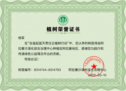 由于目前山东省内部分城市防疫形势严峻,山东分公司团委选择了“云植树”的方式,3月10日,山东分公司参加由山东自然资源厅指导、山东省互联网传媒集团主办的“在益起·蓝天责任”云植树行动,向内蒙古西部的阿拉善地区线上捐赠50棵俊俊树,向祖国西北这片广袤的沙漠里送去一份珍贵的礼物。
