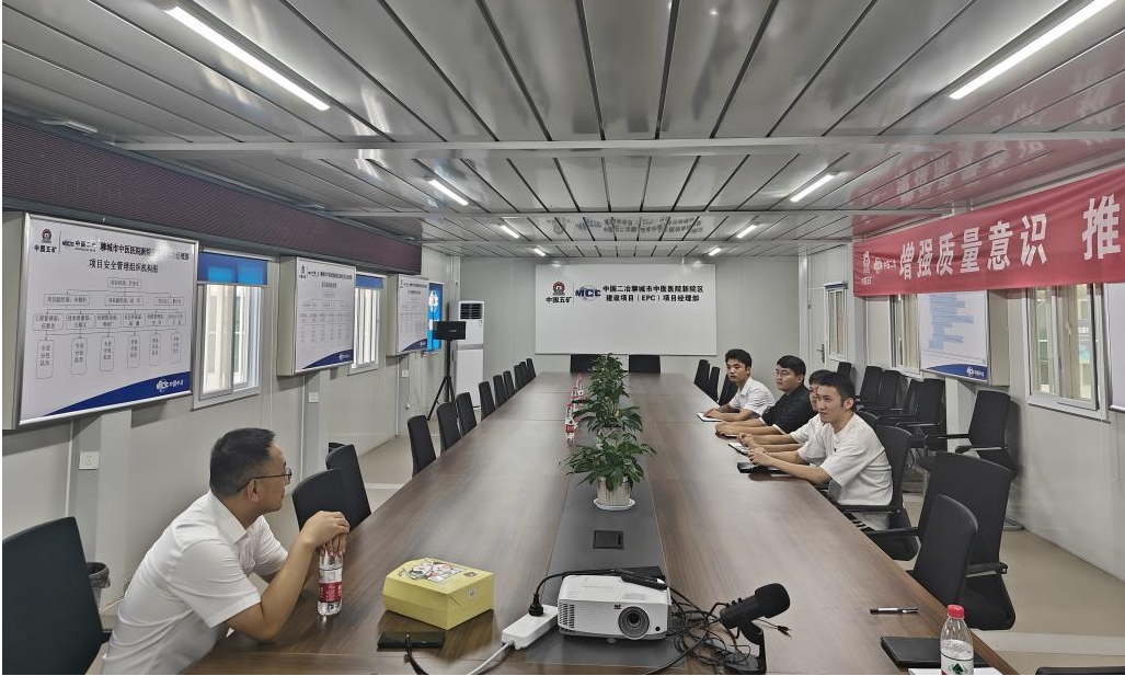 在调研过程中,尹旭与项目部职工进行座谈交流,从项目部工作和生活中等方面详细了解员工的思想状况,为他们解决实际的困难和问题,他强调,当前聊城中医医院项目处于大干施工阶段,希望项目全体员工充分发挥工作热情,加快提升个人业务能力,加强部门之间的协调合作,为项目高质量履约作出自己的贡献。党群工作部工作人员就如何加强支部党建群团工作进行部署指导,并对具体工作进行了要求。