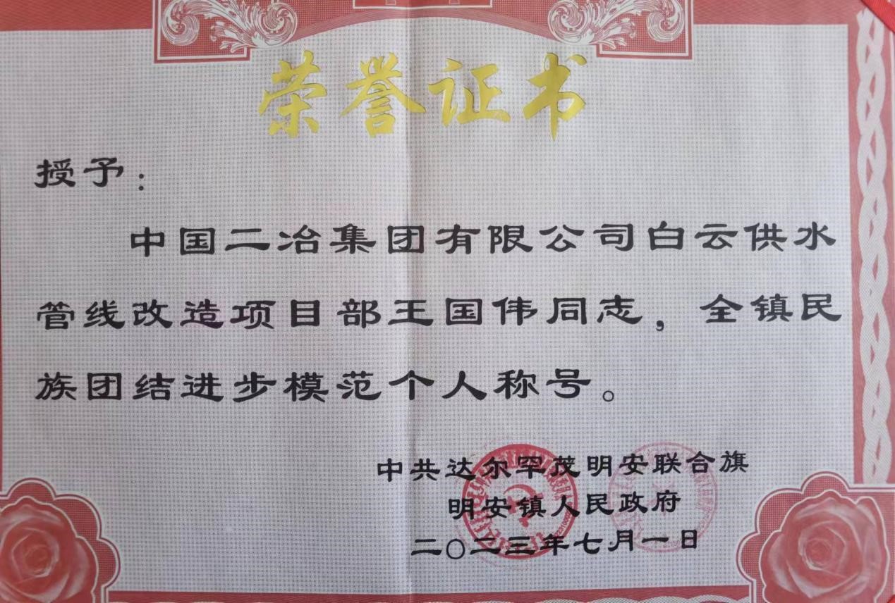 10月7日,中共达尔汗茂明安联合旗明安镇人民政府颁发荣誉证书,授予中国二冶山东分公司白云供水管网改造项目部经理王国伟同志“全镇民族团结进步模范个人”称号。