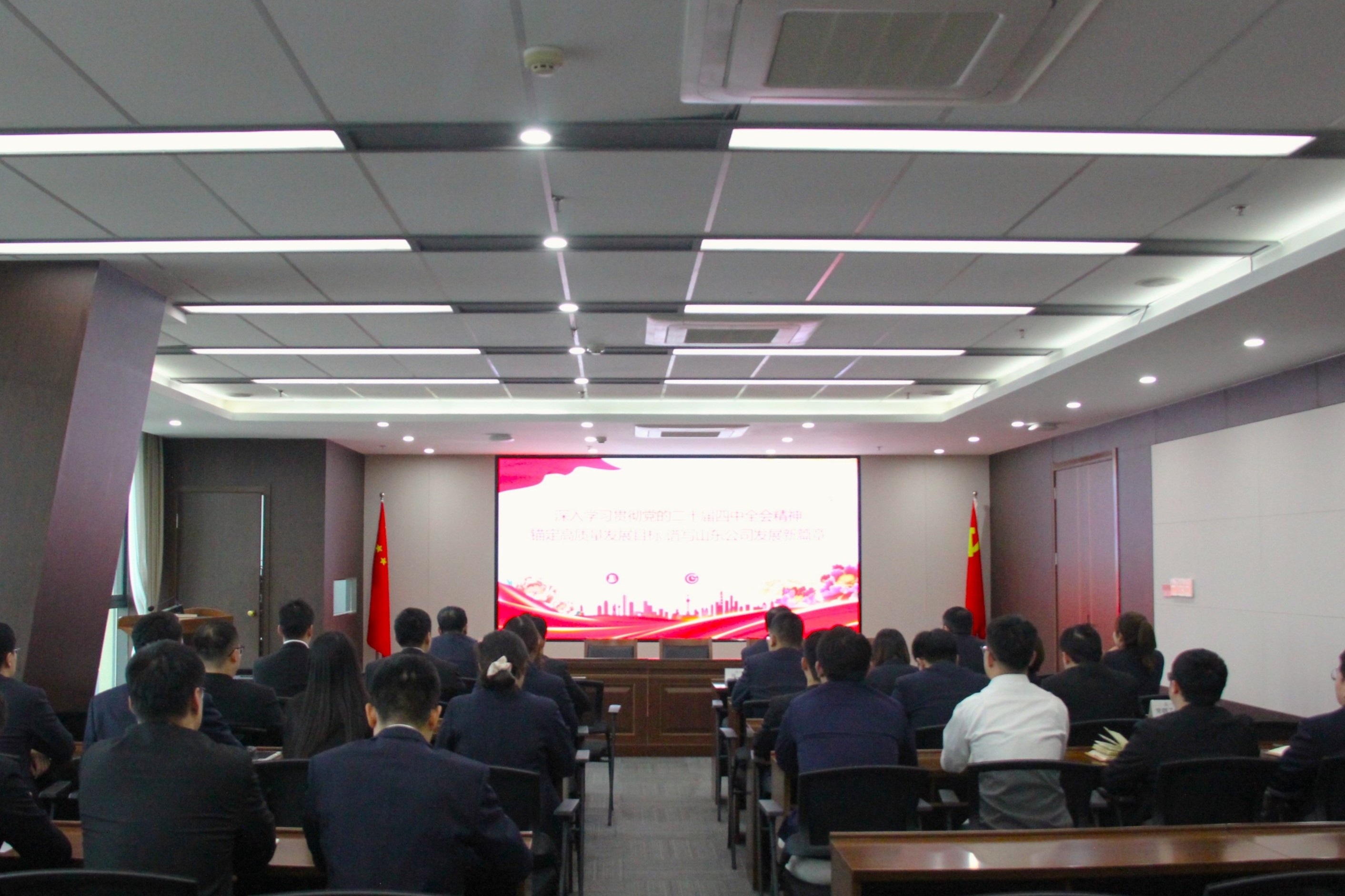 山东分公司在济领导班子、机关各部室、各项目部全体管理人员以“主会场+分会场”视频形式参加会议。