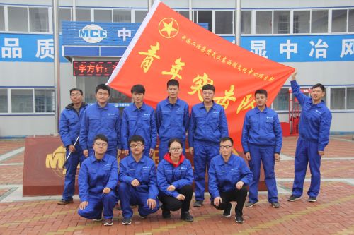 会后,他们擎起心爱的青年突击队队旗,来到项目部办公楼门前,在飘扬的国旗和中冶旗帜下合影。