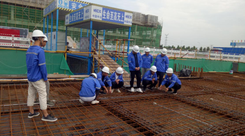 此次现场培训的教学重点主要是对现阶段的施工状况进行具体分析。针对轮扣式脚手架,结合施工情况重点讲解了其特点、要点、搭设要求及功能用途。针对土方回填,重点讲解了其注意事项,说明了回填材料要符合土料要求及含水量控制要求,同时,土方回填前要清除基底垃圾、抽除积水、挖出淤泥,结合实际,特别强调了冬季填方铺土厚度要比常温时减少20%-25%,预留沉降量比常温时增加。最后,针对结构施工测量,列举了其主要内容,包括:主轴线内控制点基准点的设置、施工层的放线与抄平、建筑物主轴线的竖向投测、施工层标高的竖向传递等。
