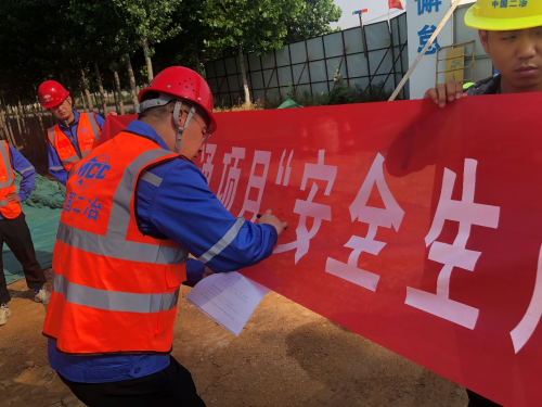 本次宣誓活动由项目部安全环保部部长主持,她向现场人员宣读了中国二冶集团安全施工要求,就几点注意事项做了重点强调,要求管理人员必须加强对各位施工人员的管理工作,落实好实名制通道管理;每日对现场道路进行拍照和检查,完善每日日报,并对公司安全检查小组提出的整改意见,加强整改落实。宣读完毕后,项目经理带领项目部全体管理人员与施工工人举起右拳庄严宣誓。宣誓过后,管理人员与现场施工工人共同在横幅上签名。