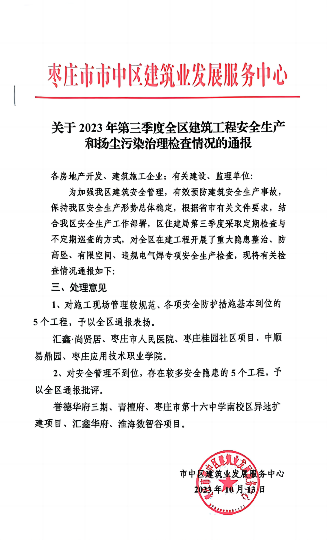 10月18日,山东分公司枣庄市市中区建筑业发展服务中心面向全区公布了2023年第三季度全区建筑工程安全生产和扬尘污染治理检查情况,山东分公司枣庄市人民医院项目获枣庄市市中区表扬。