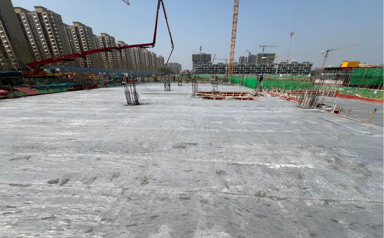 为保证浇筑进度与质量,项目部统筹规划、周密部署,争分夺秒,全体管理人员与施工劳务作业人员相互协作,大干快上,加班加点赶进度、抢浇筑,带班领导跟班坚守岗位,项目部管理人员24小时轮流值班跟班作业,对每个浇筑节点进行严格把关,确保混凝土供应的及时性、连贯性。历时20小时,顺利完成首个单体地下室顶板混凝土浇筑作业。