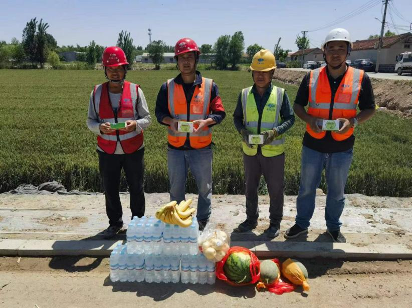 施工现场,工友们的汗水湿透了衣衫,却从未停歇手中的工作。他们深知,每一个细节都关乎着施工安全与稳定,项目部为缓解高温带来的影响,为工人们提供防暑工作环境,准备充足清凉的饮用水,新鲜水果以及防暑药品。同时,在工地各施工区域实行“抓两头、歇中间”的工作安排,有效规避高温时段。在施工现场,设置了多处遮阳棚,确保工人们能够及时得到补充,有效预防中暑和其他高温病症的发生。