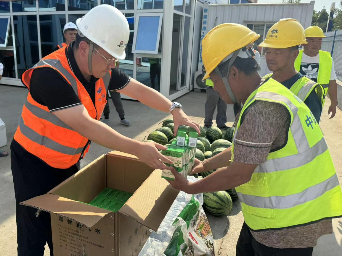 项目部筹办“清凉一夏”送清凉活动,活动现场,项目经理为坚守在一线的工人送上了西瓜、绿豆、矿泉水、藿香正气水等防暑降温物资。同时,与工人们亲切交流,询问他们的工作和生活情况,并叮嘱工人们要合理安排工作时间,避免在高温时段进行高强度作业,亲切的语言让工人们在酷暑中感受到一丝凉爽。