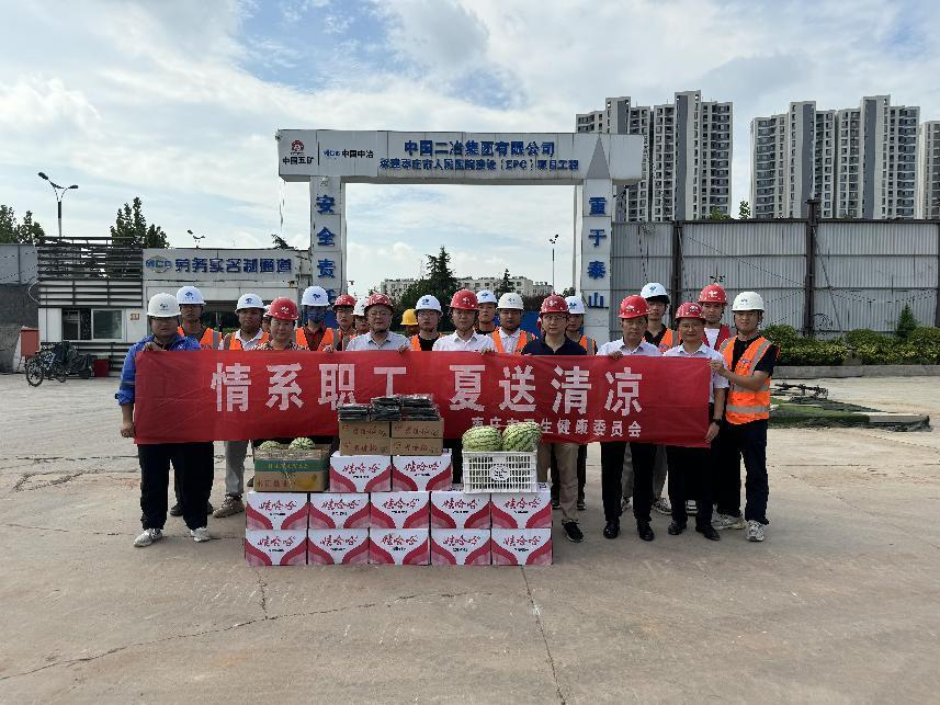 在项目现场,市卫健委领导首先详细了解了项目的建设进度、工程质量以及安全生产情况,对项目部在高温天气下依然保持高效有序的施工状态给予了高度评价,并将饮料、老冰棍、西瓜等防暑降温物资发放到建设者们的手中,叮嘱大家合理安排工作与休息时间,确保在高温天气下也能保持良好的工作状态。