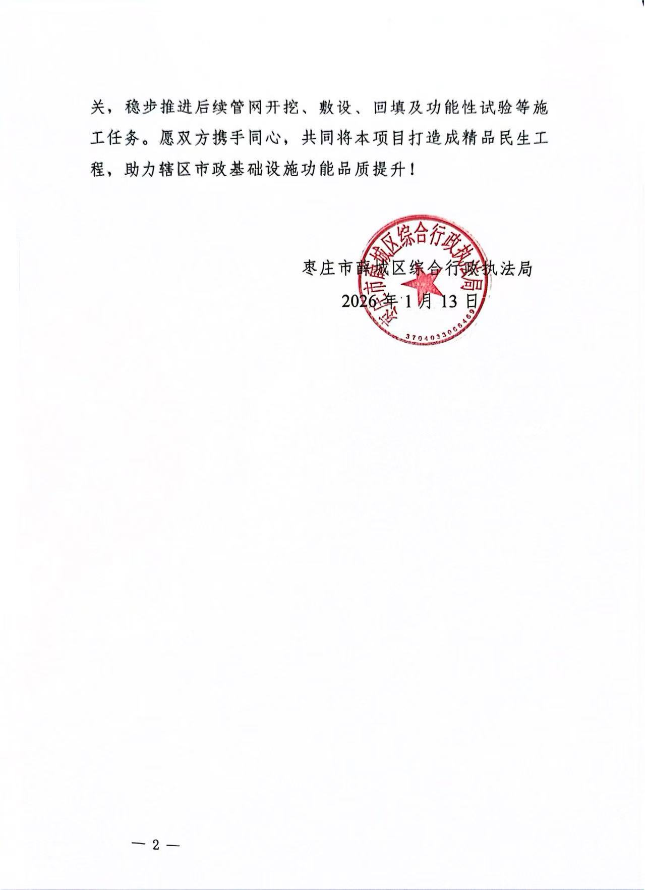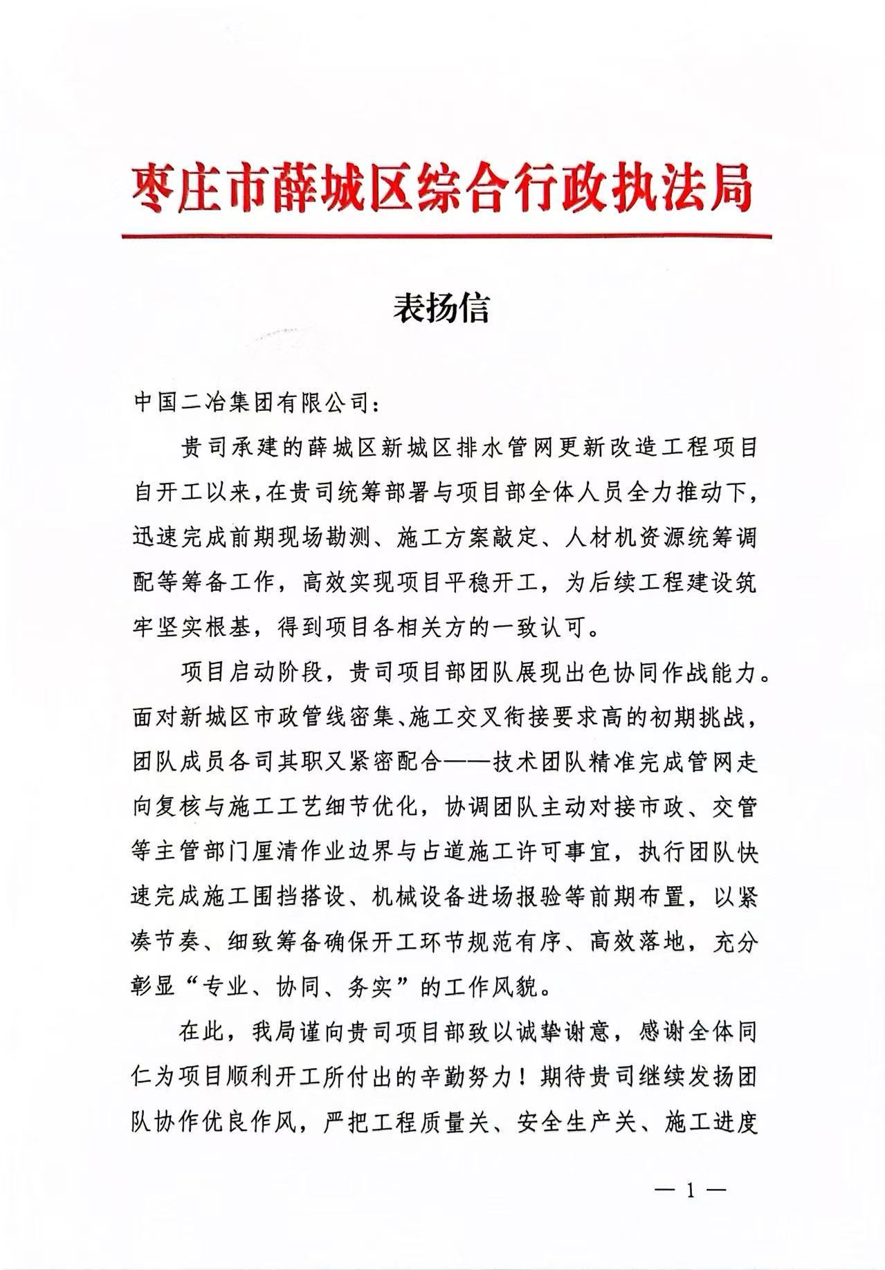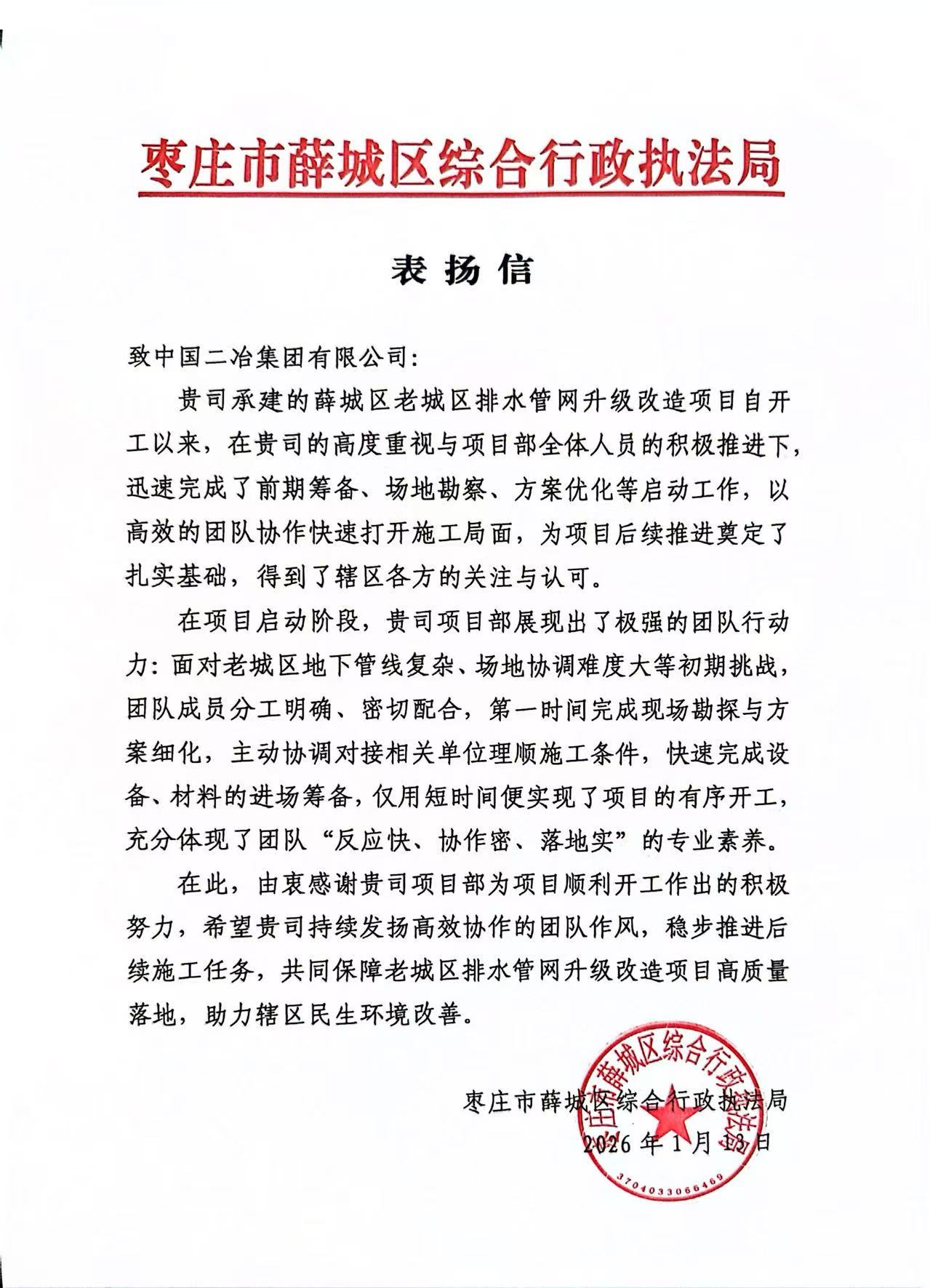 枣庄市薛城区综合行政执法局在表扬信中表示,在薛城区新、老城区排水管网升级改造项目实施过程中,中国二冶高度重视、团队协作有力,充分体现了“专业、协同、务实”的企业风貌。