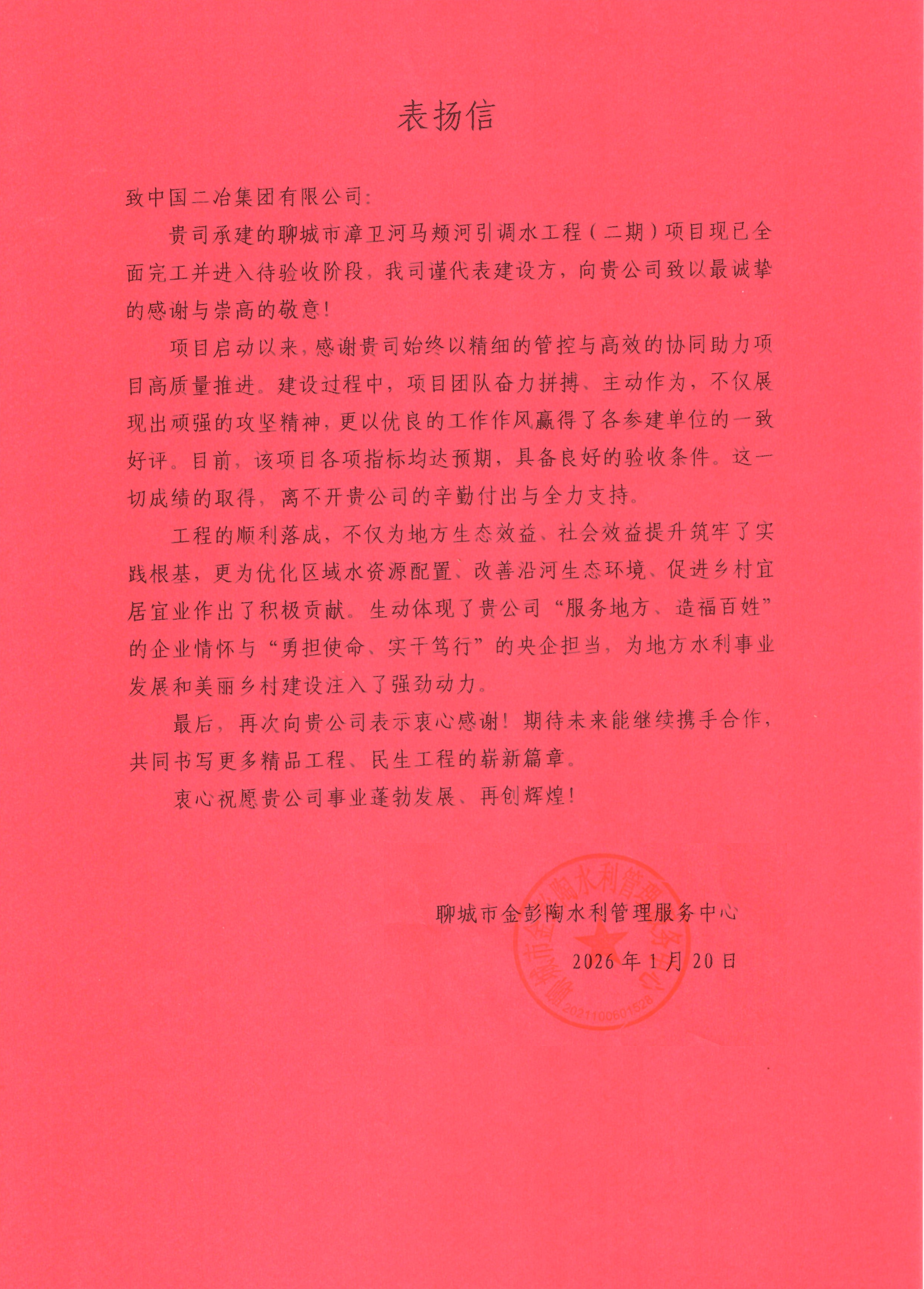 聊城市金彭陶水利管理服务中心则对漳卫河马颊河引调水工程(二期)项目团队提出表扬。信中指出,该项目团队在建设中迎难而上、主动担当,展现出优秀的攻坚能力和扎实的工作作风。