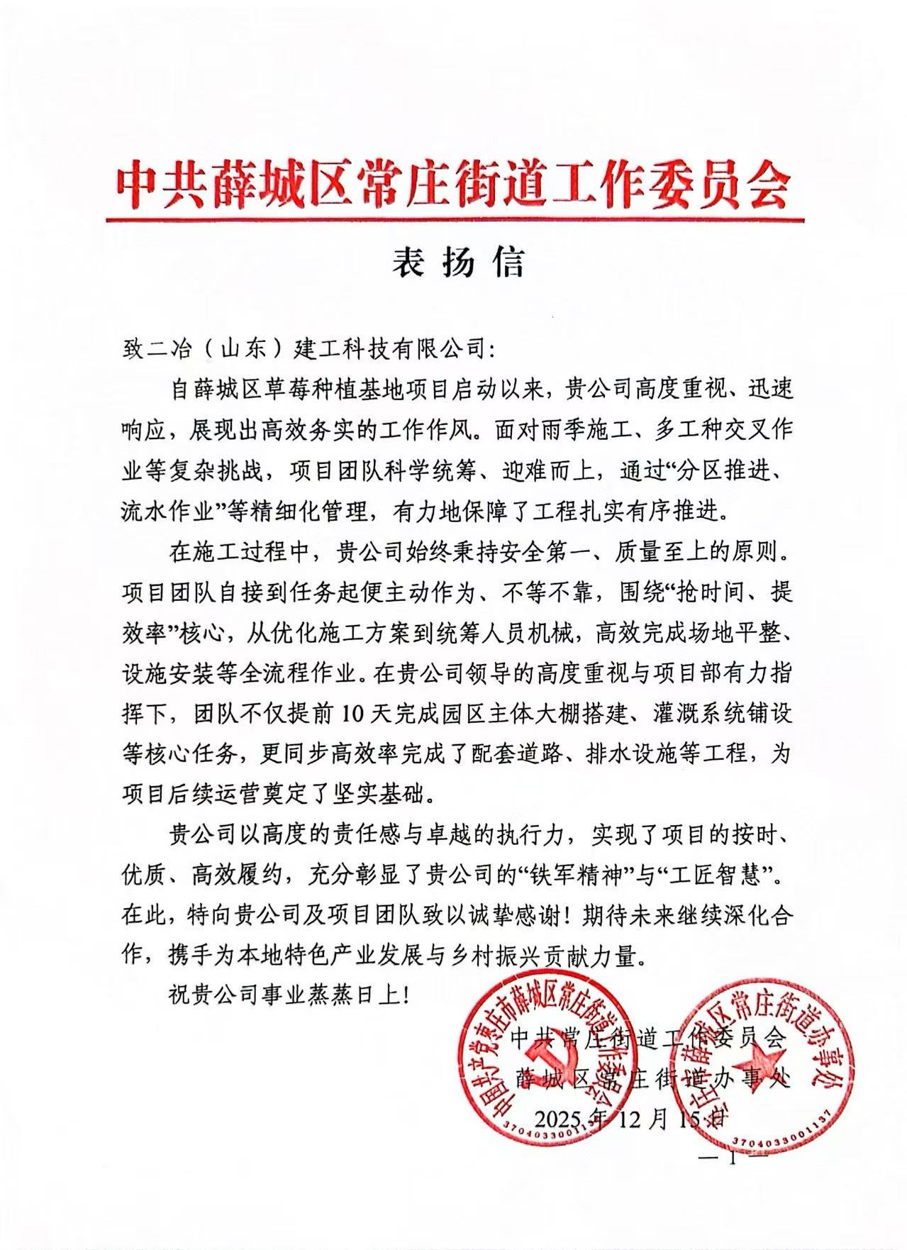 中共常庄街道工作委员会、薛城区常庄街道办事处在来信中特别提到,薛城区草莓种植基地项目团队以高效务实的管理,提前10天完成园区核心任务,生动诠释了“铁军精神”与“工匠智慧”。